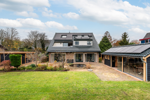 De prachtige keuken is uitgevoerd in een royale U-opstelling, volledig greep loos en afgewerkt in een antraciet betonlook met houtlook werkbladen, spatrand en achterwand achter het kookgedeelte. Het verlaagde plafond met inbouwspots zorgt voor extra sfeer. Uiteraard is de keuken voorzien van hoogwaardige apparatuur, waaronder een koelkast, vriezer, Quooker kraan, inductiekookplaat met RVS afzuigkap, combimagnetron en een vaatwasser. Dankzij de vele lades is er volop opbergruimte aanwezig.
